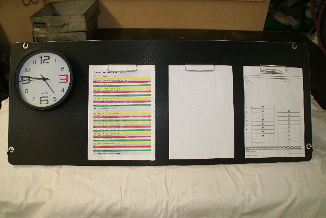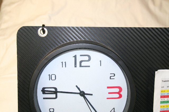 Zeittafel mit Uhr und 3 Klemmhalter zum Aufhängen mit Ösen, Material kunststoff, mit Carbonfolie beklebt. Maße: